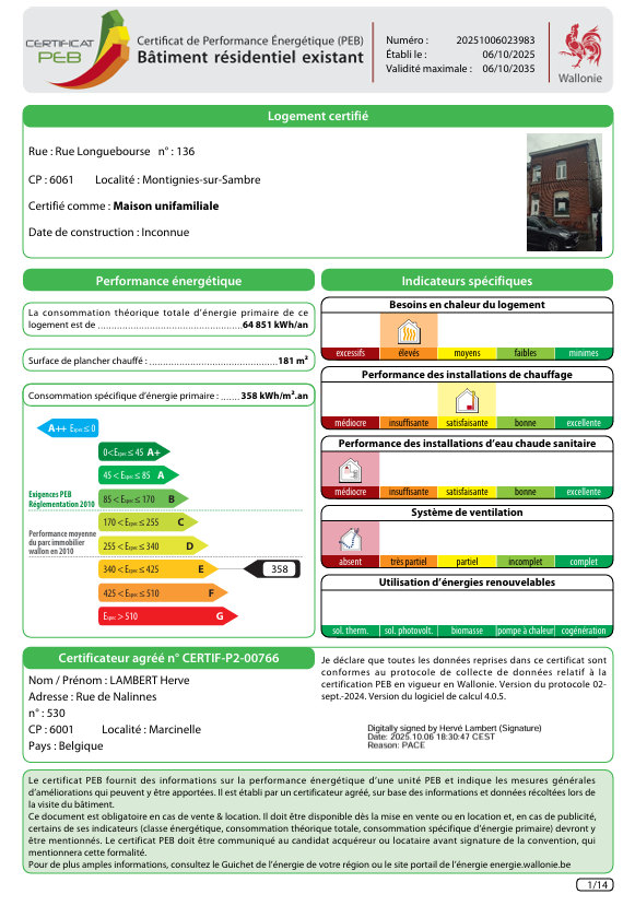 Indice mondial de performance énergétique: 358 kwh/m².an